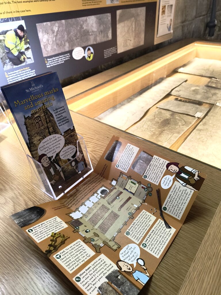 It has been a pleasure working with the church team to put together a family-friendly display to complement the lovely new wooden graffiti display and storage case in the church. The free exhibition sheds light on the significance of the graffiti and the colourful stories it tells about the people of Alnwick over the last 250 years. There is even the opportunity to make your own ‘lead’ tile and leave your own mark. The church is rich with history, so design colleague Marcus Byron and I also created a leaflet to help visitors find other kinds of marks around the church and think about the wide range of people, skills and materials who have built and brought the building to life over the generations.
